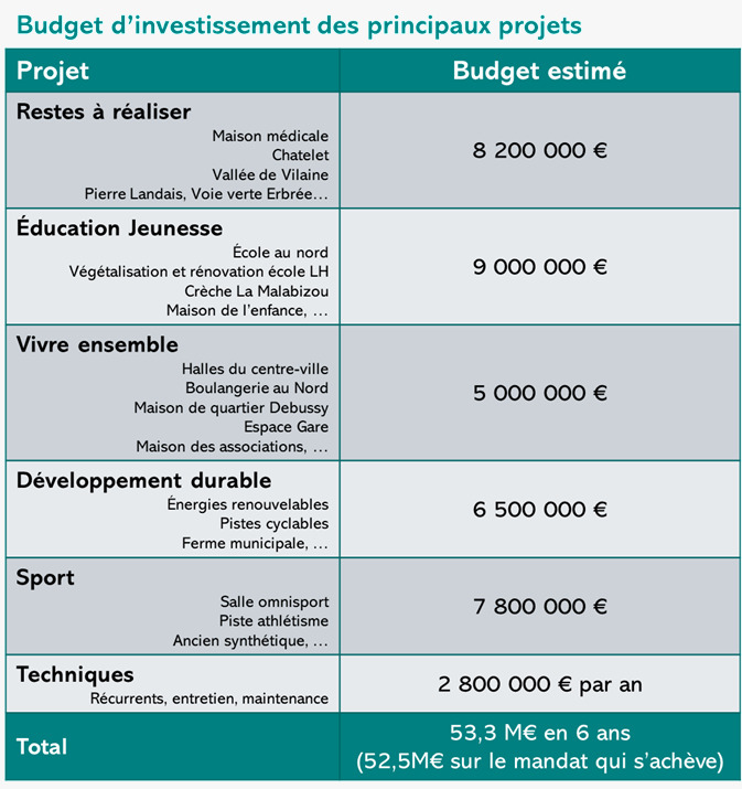 Notre projet prévoit 53,3 millions d’euros d’investissements sur six ans, un niveau comparable à celui du mandat qui s’achève, qui représente environ 52,5 millions d’euros d’investissements.